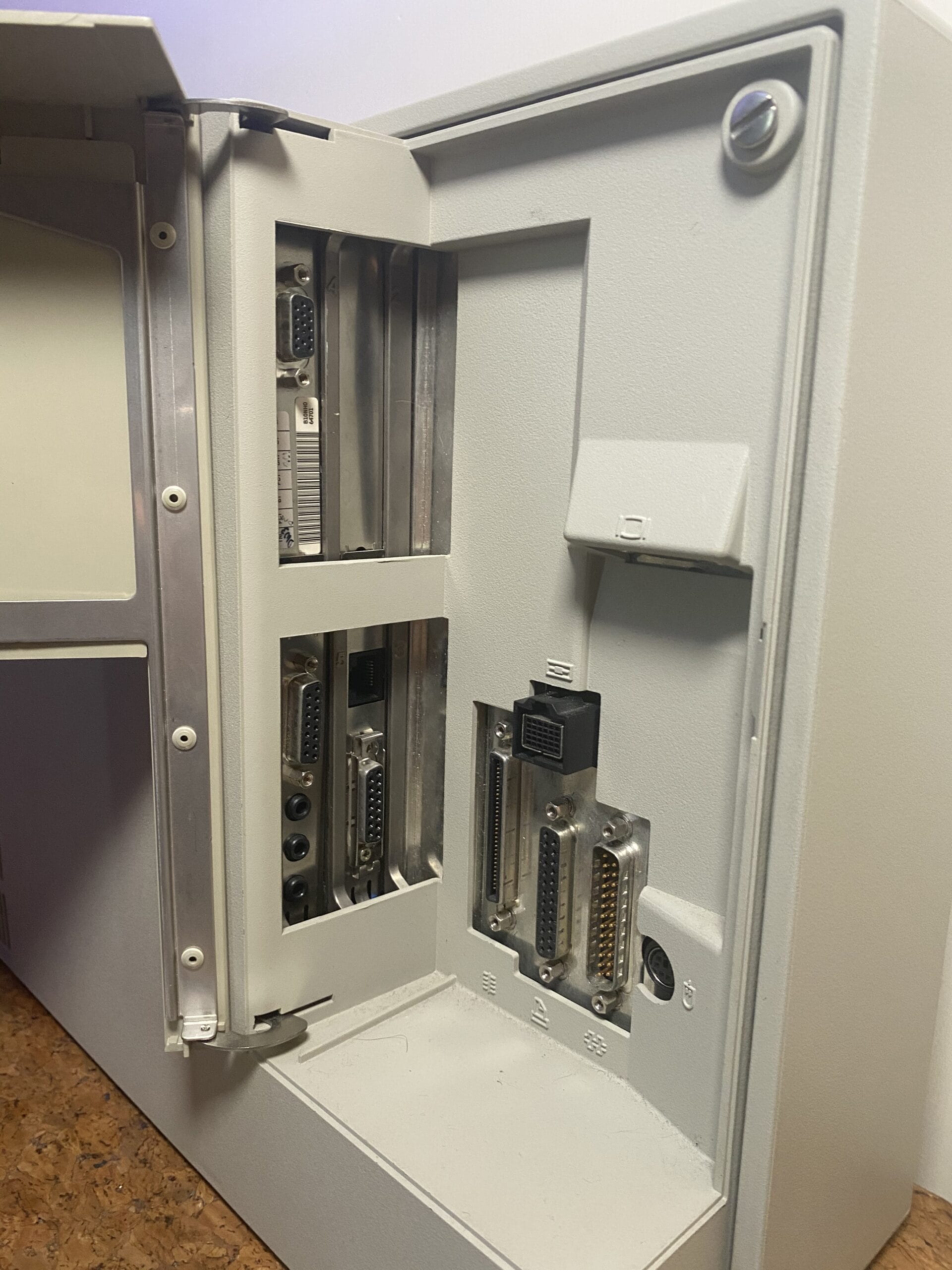 Taking a closer look at the I/O port and expansion card area behind the door, we can see that the P75 has all its desktop counterparts’ ports. From left to right, we have a SCSI port, an IBM 5.25 floppy disk drive port, a parallel port, a serial port, and a PS/2 mouse port. Yes – the same PS/2 port that came in green and purple on all computers in the ’90s and into the 2000s. This recessed area also allows you to coil up and store the power cable when the unit is in transit.