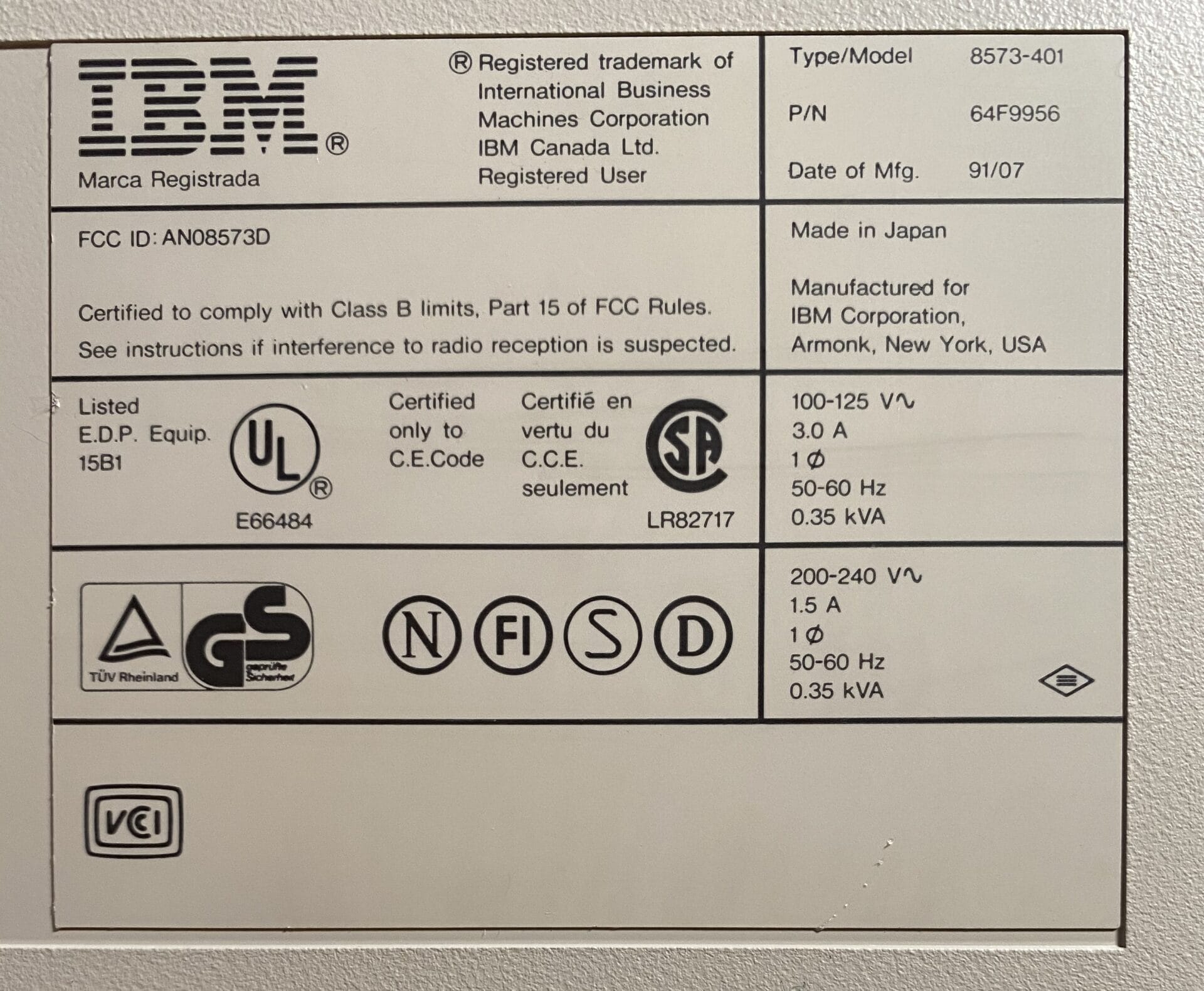 Taking a look down under – we can see the very official-looking IBM sticker with the model number and manufacturing date – my unit was made in 1991 – hopefully meaning that whoever purchased it paid a little less than the $18,500 sticker price when it was new in 1990. IBM also very proudly displays their FCC Class B certification for a reason. It was meeting the standards of this certification that made the IBM P75 the first 486 based portable for “legal sale and use” in the United States. Other manufacturers, particularly in Asia and Europe, likely had 486-class portables on the market, but they could not be sold in the U.S. as they did not have the FCC Class B certification.